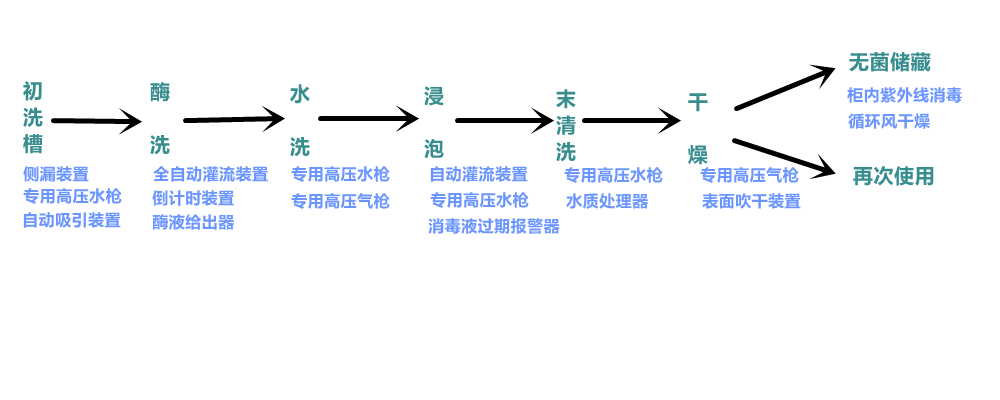 軟性內(nèi)窺鏡:五方槽分段清洗組合,第一槽為初清洗,第二槽為酶浸泡,第三槽為次清洗,第四槽為戊二醛浸泡,第五槽流水末清洗。